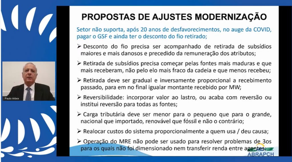 O moderador do Painel, Paulo Arbex, defendeu ações de modernização no mercado: “Precisamos modernizar o setor. O PL é pertinente neste sentido. Defendemos principalmente a retirada de subsídio gradual, começando pelas fontes maduras e que mais receberam. Se organizarmos o setor elétrico, conquistaremos benefícios enormes para o país”, disse o Presidente da Diretoria Executiva da ABRAPCH.