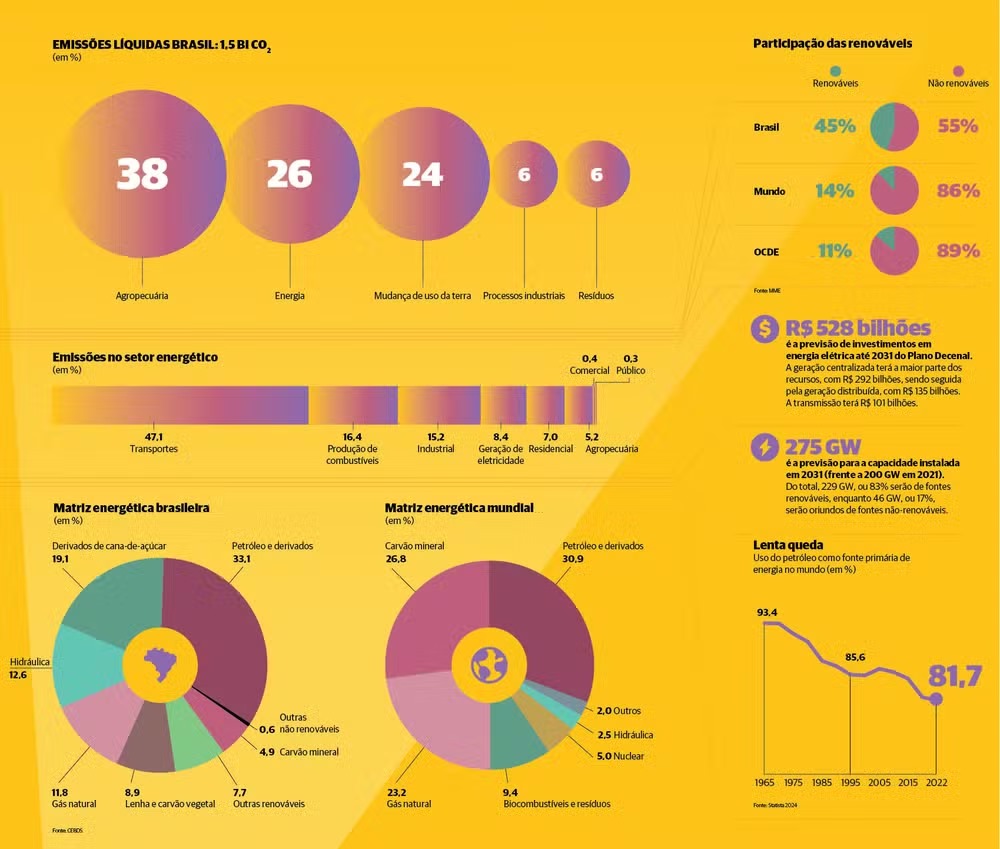 O Brasil foi o terceiro país no mundo que mais atraiu investimentos em energias renováveis em 2023, totalizando mais de US$ 25 bilhões, segundo dados da BloombergNEF (BNEF), atrás apenas da China e dos Estados Unidos. Considerando todos os segmentos da transição energética e tecnologias de baixo carbono, o investimento no país totalizou US$ 34,8 bilhões, atrás de China, Estados Unidos, Alemanha, Reino Unido e França.
