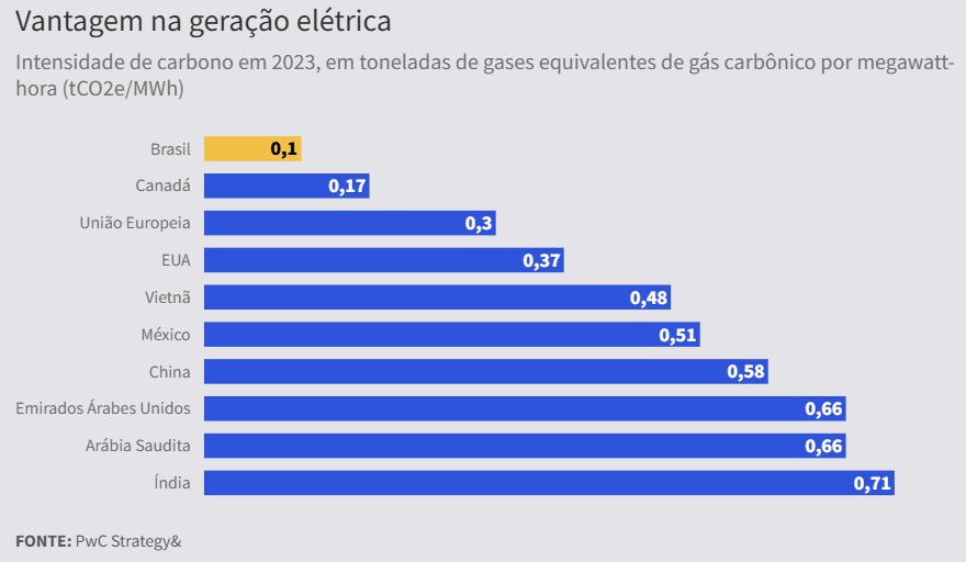 Um estudo da PwC Strategy, encomendado pela Abrace Energia (associação que representa os grandes consumidores de energia do País), aponta que, enquanto a China emite 580 quilos de carbono para gerar um megawatt de energia por hora, o Brasil emite 100 quilos. Nos Estados Unidos e no Canadá, a emissão é de 370 quilos e 300 quilos, respectivamente.